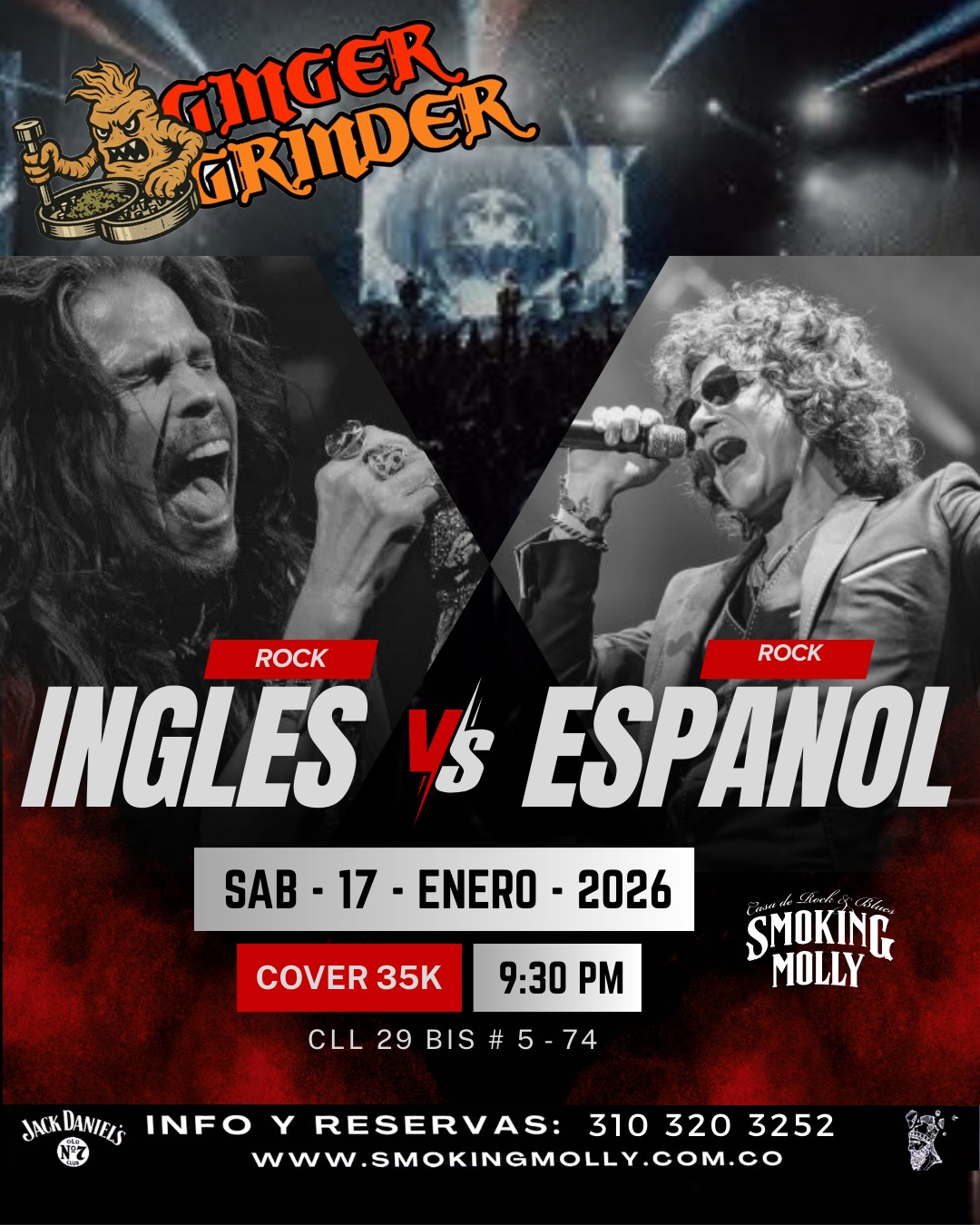 #RockInglesVsEspanol #GingerGrinder #RockEnVivo #SmokingMolly #RockBogotá #ClasicosDelRock #NocheDeRock #MusicaEnVivo 🤘